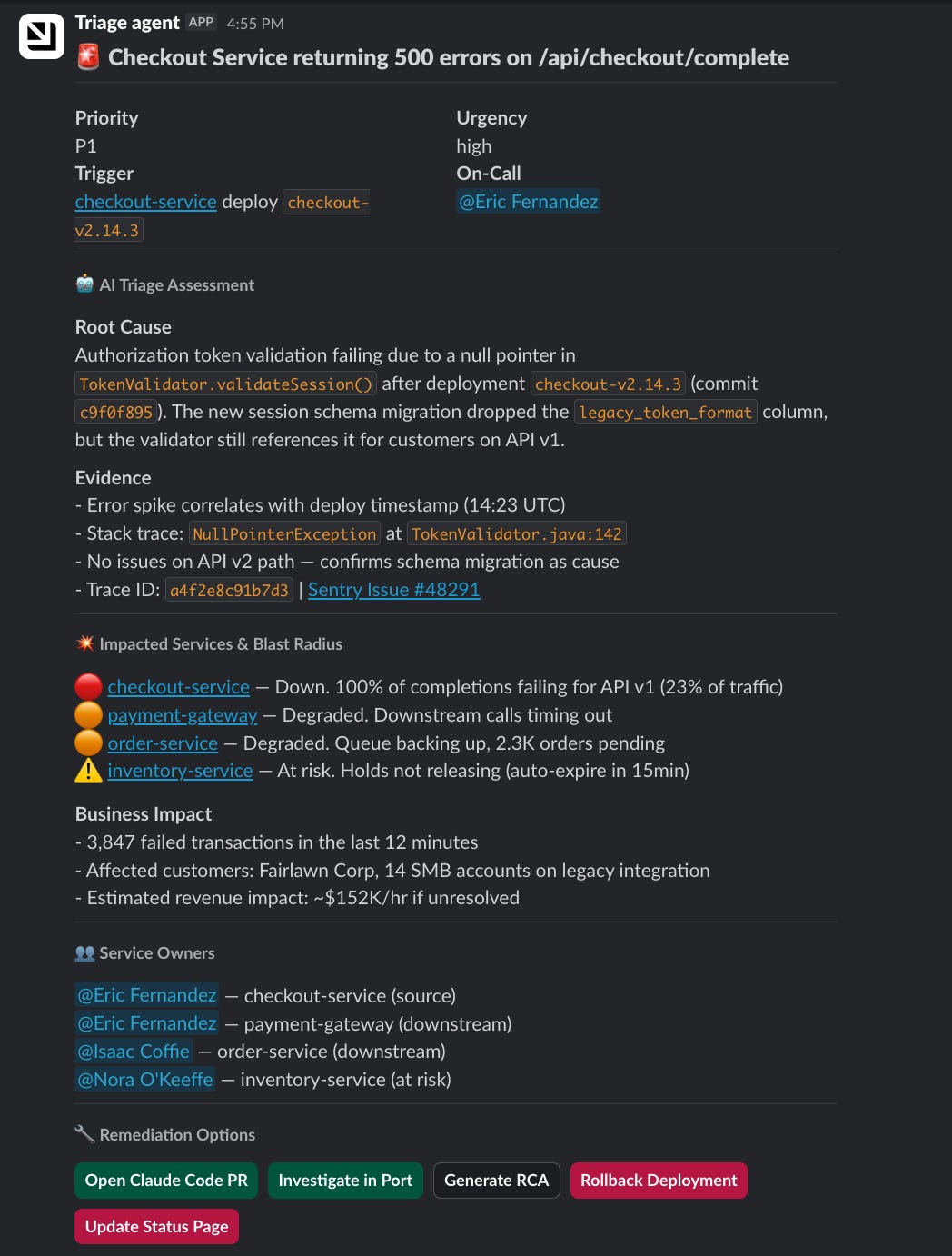 We’re building toward an agent that handles the full incident lifecycle. But the first piece is already live: an agent that triages the incident in Port and posts a message to on-call engineers in Slack within minutes.