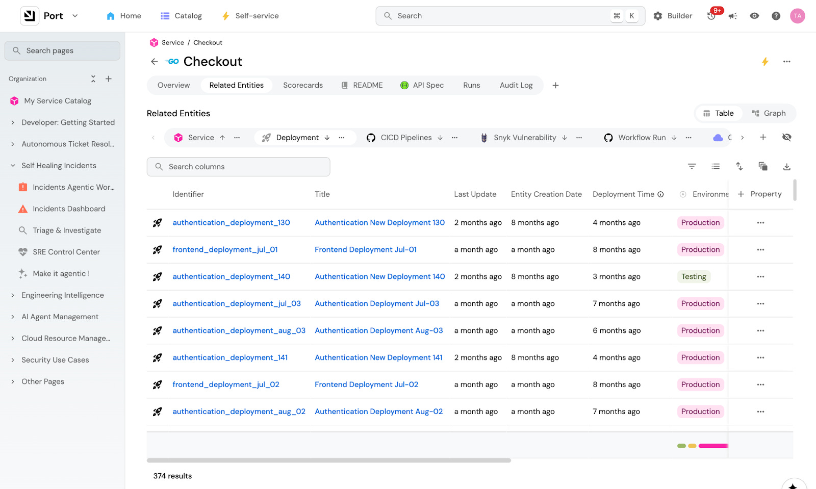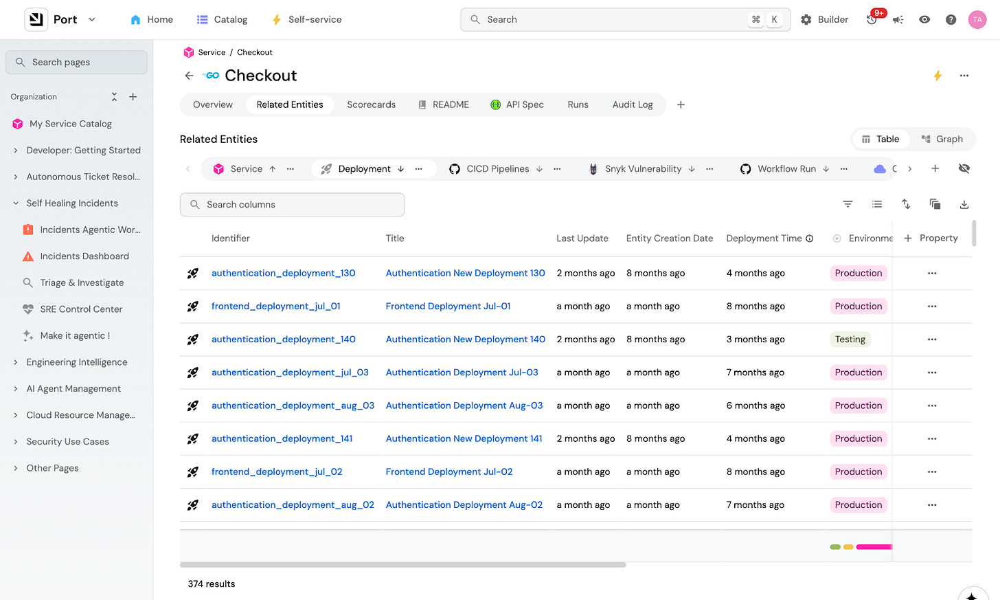 The Port Context Lake gives the agent everything it needs to know about how our SDLC behaves. It holds everything about our micro-services, deployment history, CI/CD jobs, ownership, dependencies, vulnerabilities, team structure, and much more. When the agent finds a failing service, it already knows who owns it, what recently deployed, what other services depend on it, and which customers are affected because everything in Port is connected.