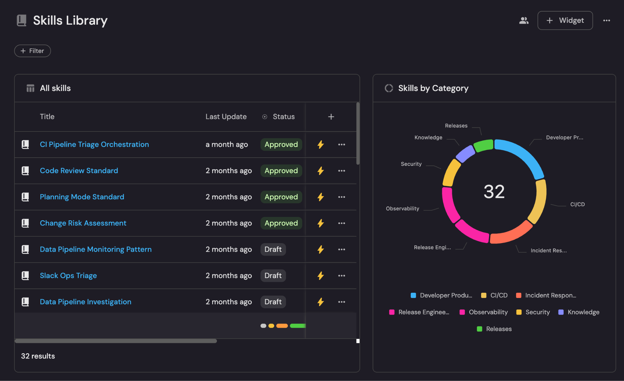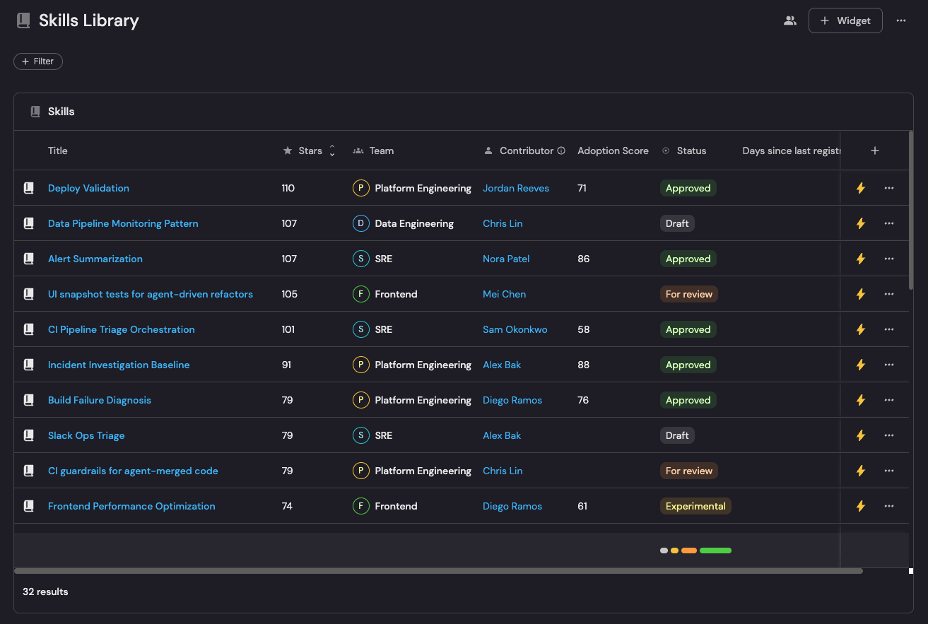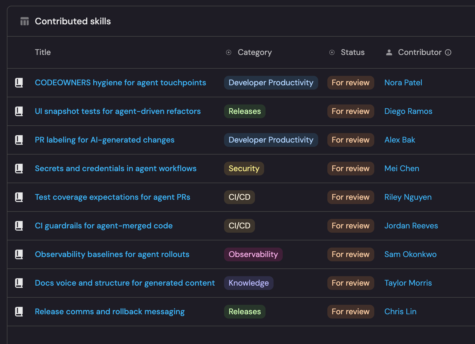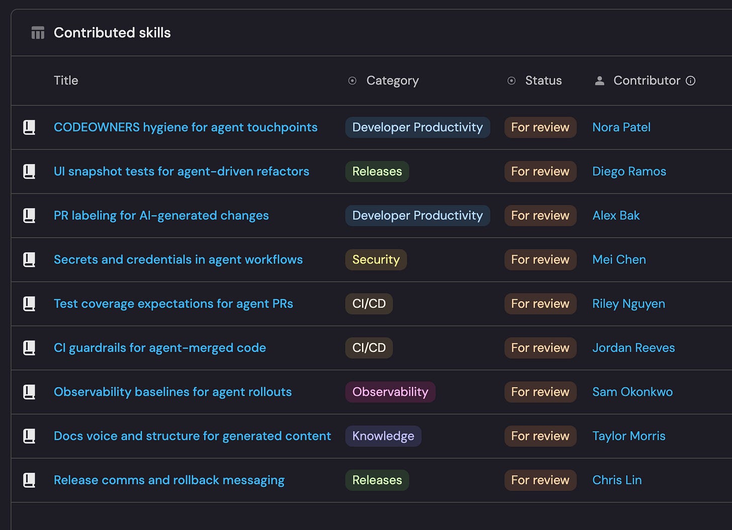 We also track skill health: how old each skill is, when it was last updated, who owns it. Skills go stale just like documentation does. Anything that hasn’t been touched in 90 days gets flagged.