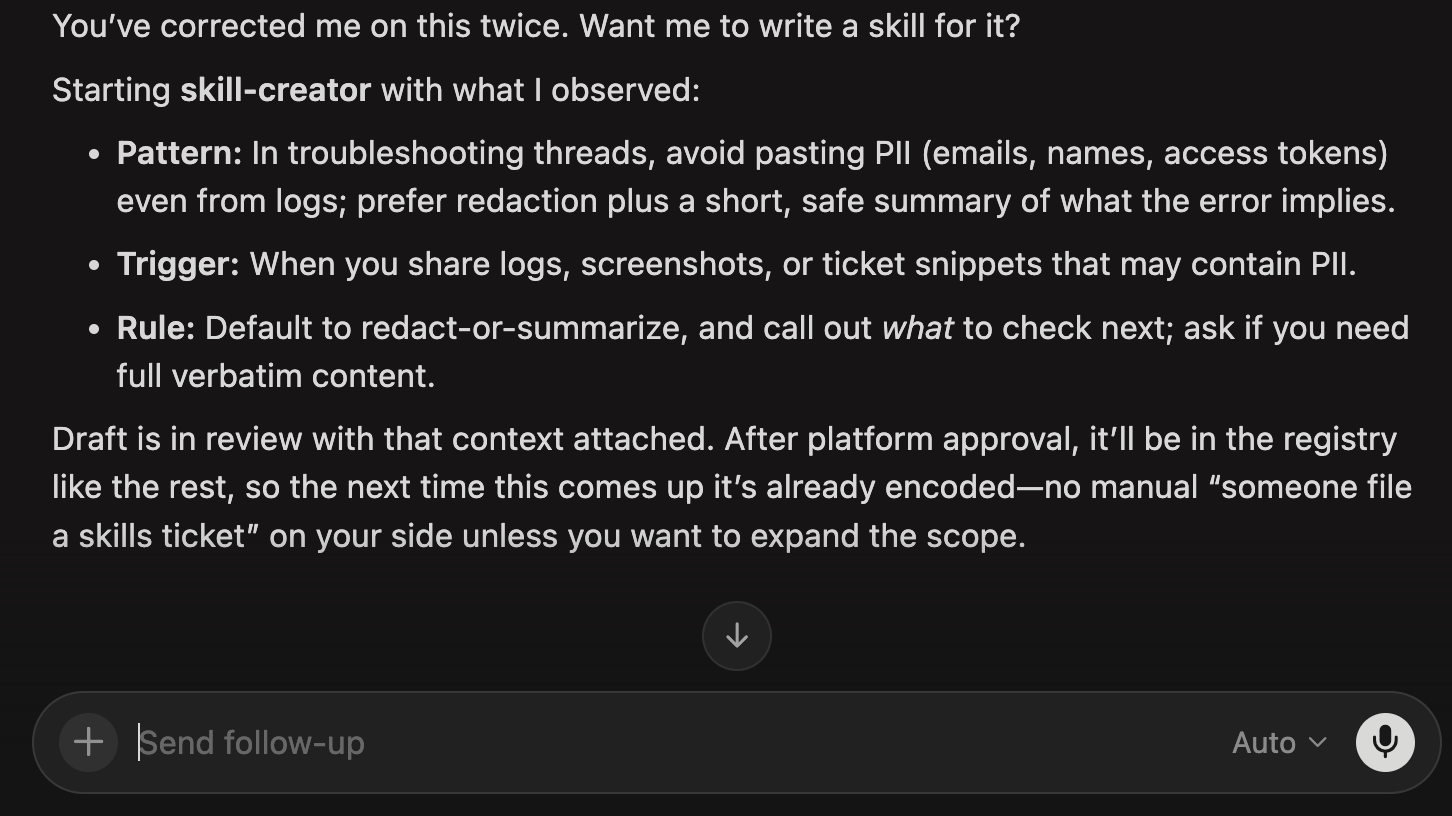 We also have a meta-skill: a skill whose job is to watch for repeated corrections. When you fix the agent on the same thing twice in a session, it surfaces: “You’ve corrected me on this twice. Want me to write a skill for it?” If you say yes, it kicks off the skill-creator automatically, pre-loaded with what it just observed.